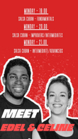 Met onze app kan je het volledige uurrooster bekijken voor Salsa L.A., Cubaanse Salsa, Bachata Moderna, Bachata Sensual, Urban Kiz / Kizomba Fusion en Solo Styling (Bachata, Salsa). Reserveer meteen je plaats en verzeker je ervan dat je erbij bent voordat de les volzet is.